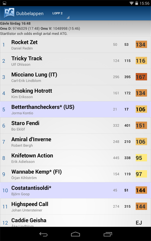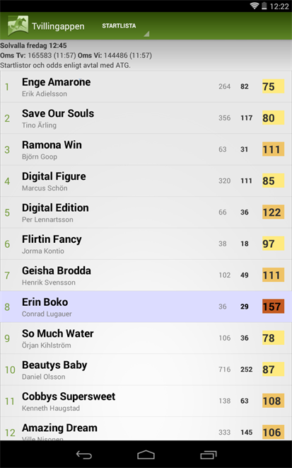 På samma sätt som kombinationer kan vara spelvärda på Tvilling så kan enskilda hästar vara det också. I startlistorna nedan visas genomsnittligt tvillingindex för alla kombinationer som innehåller en viss häst längst till höger. Bakgrundsfärgen för snittindex är på samma sätt som i matrisvyn ovan baserad på indexvärdet.