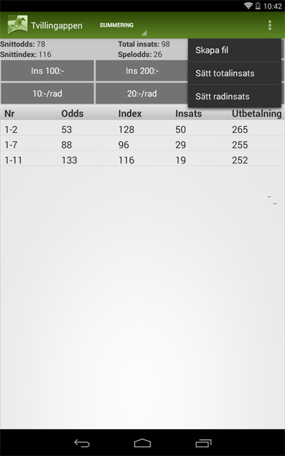 Om spelaren önskar annan insats så kan knapparna för att sätta totalinsats väljas eller så finns det fler alternativ i menyn längst uppe till höger. I menyn finns också på Android möjlighet att skapa en spelfil för att lämna in på ATG.se.